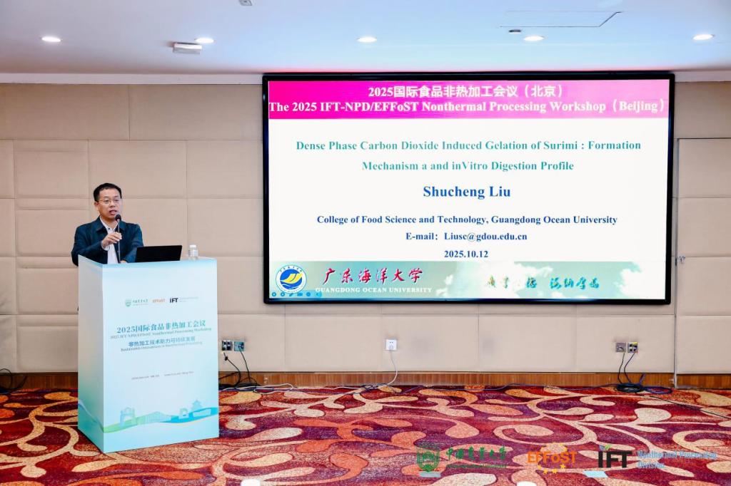 10月10-13日,suncitygroup太阳新城刘书成教授带领团队老师和研究生参加了在北京召开的2025国际食品非热加工会议。suncitygroup太阳新城受邀作为本次会议的协办单位,刘书成教授作为本次会议的组织委员会委员,受邀主持了大会的分论坛1:基于压力的非热加工技术,并在论坛上作了“Dense Phase Carbon Dioxide Induced Gelation of Surimi: Formation Mechanism and in Vitro Digestion Profile”的学术报告。团队老师和研究生也分别在大会上做了学术报告,充分展示了我集团“海洋食品绿色加工技术”创新团队在高密度二氧化碳、超声波、磁场、低温等离子体、高压静电场等非热加工技术的最新技术成果,并与全球食品领域的知名学者、行业领袖及企业代表,共同探讨非热加工技术的前沿进展与产业化路径,推动食品产业向绿色、高效、高品质方向转型升级。
